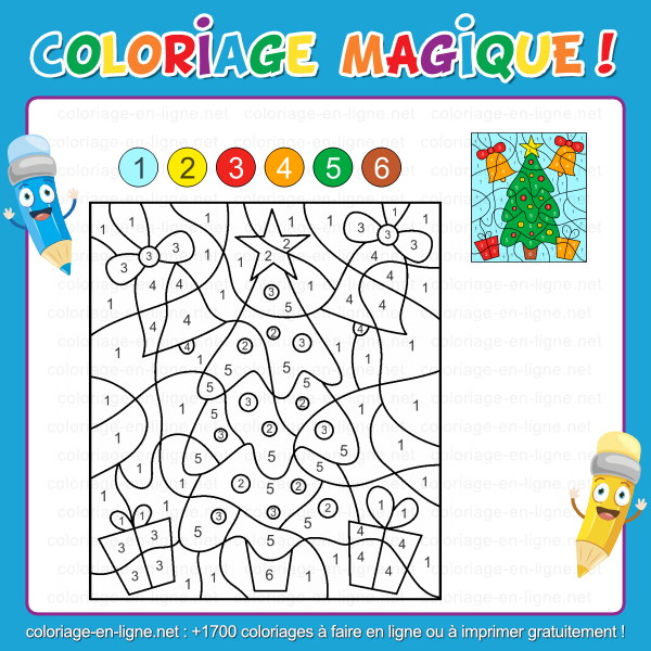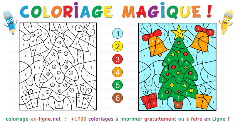 Ce coloriage magique de Noël propose une scène pleine de lumière et de bonne humeur : un superbe sapin décoré trône au centre du dessin, entouré de jolis cadeaux et de cloches festives. Pour révéler chaque détail, il suffit de suivre les numéros inscrits dans chaque zone : une couleur correspond à un chiffre, et le tableau prend vie petit à petit, comme par enchantement. C'est une activité parfaite pour les enfants qui aiment les jeux de logique tout autant que les coloriages créatifs.
