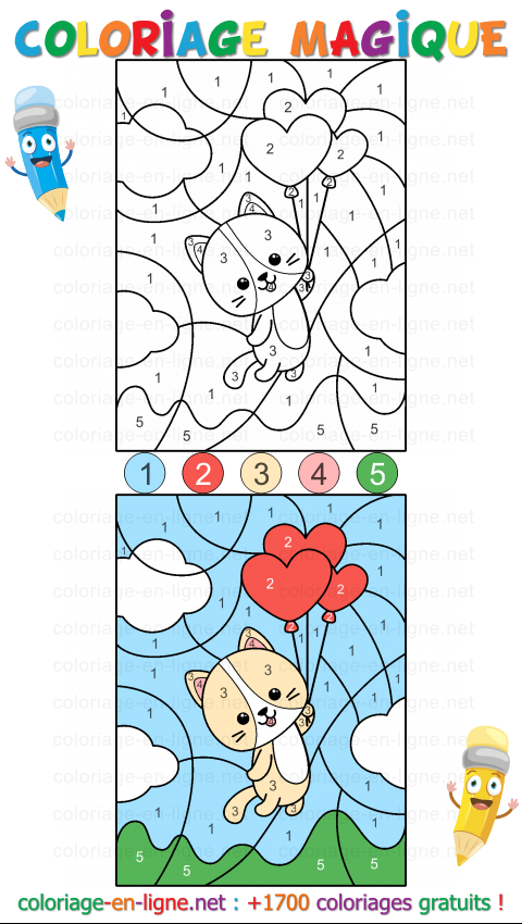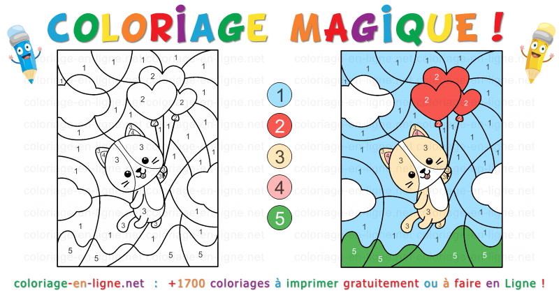 - Chaton mignon et ballons rouges (coloriage magique de 5 couleurs)