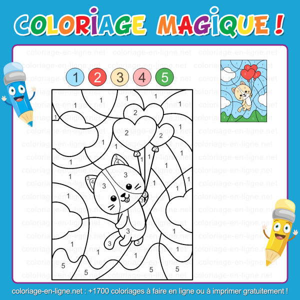 Découvre ce coloriage magique d'un adorable chaton aux ballons en forme de cœur ! Suspendu dans le ciel, ce petit compagnon semble s'envoler tout doucement grâce à ses jolis ballons rouges. Pour révéler l'image complète, il te suffit de suivre les numéros inscrits dans chaque zone et d'appliquer la couleur correspondante. Petit à petit, les formes se remplissent, les cœurs prennent vie et le dessin apparaît comme par enchantement.