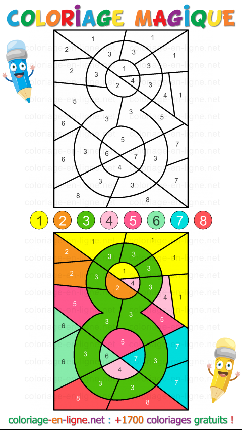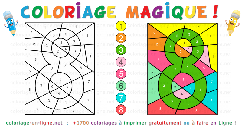 - Chiffre huit en couleurs et en surprises (coloriage magique de 8 couleurs)