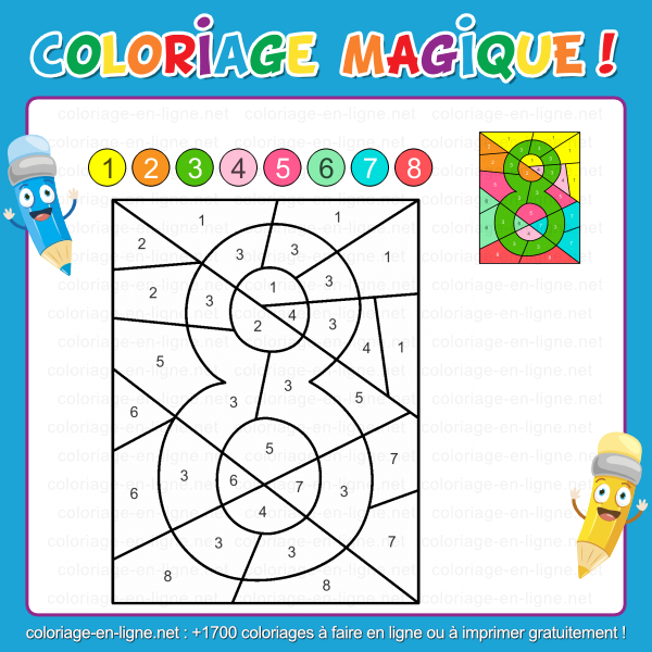 Le coloriage magique en ligne permet de jouer directement sur écran, de manière rapide et ludique. La version coloriage à imprimer est idéale pour profiter d'un moment plus calme avec des crayons ou des feutres. Une façon amusante de faire connaissance avec le chiffre 8, de le mémoriser plus facilement et de remplir la page de couleurs éclatantes.