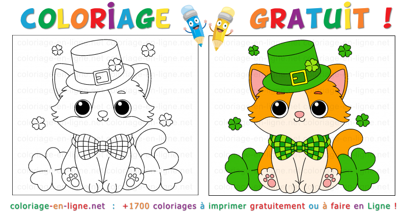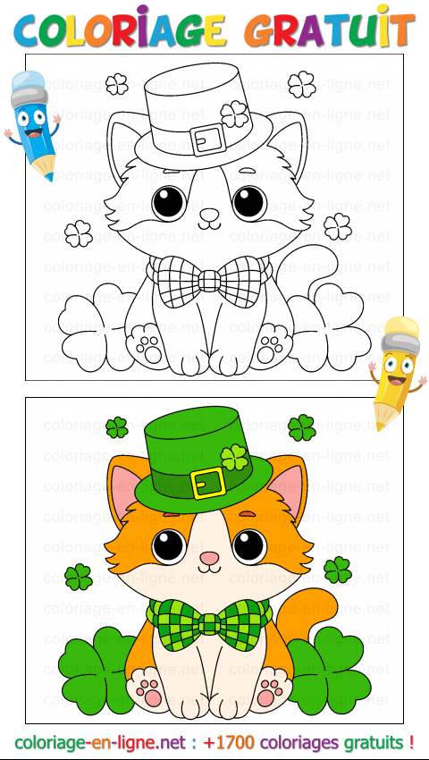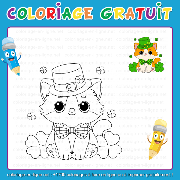 Ce coloriage de la Saint-Patrick est parfait pour sâamuser, explorer les couleurs et laisser parler son imagination. Il peut être colorié directement en ligne pour un moment créatif rapide, ou imprimé afin de prendre le temps dâajouter de jolis détails avec des crayons ou des feutres. Alors ouvre ta palette de couleurs et donne vie à ce petit chat élégant. Avec chaque touche de vert et chaque nuance choisie, ce coloriage deviendra une scène joyeuse pleine de fantaisie⊠et peut-être même un petit porte-bonheur dessiné rien que pour toi.