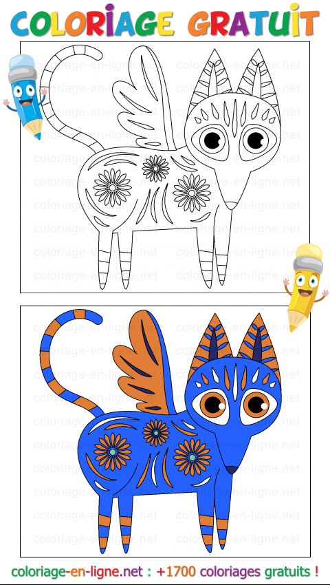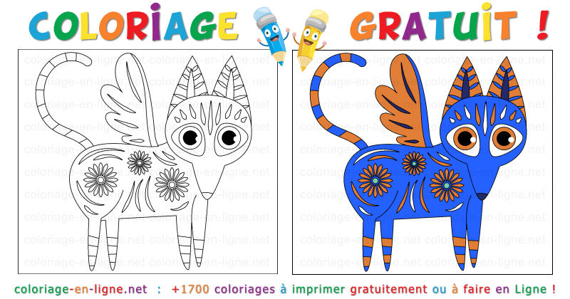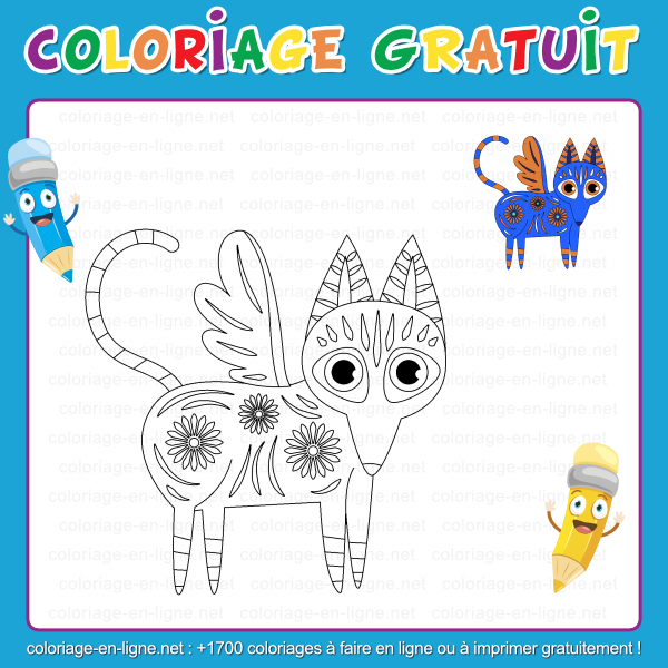 Ce coloriage représente un alebrije, une créature imaginaire née de l'art populaire mexicain. Les alebrijes sont des animaux fantastiques, mélangeant souvent plusieurs formes (ailes, cornes, queues ou oreilles exagérées), et peints de couleurs vives et de motifs décoratifs.