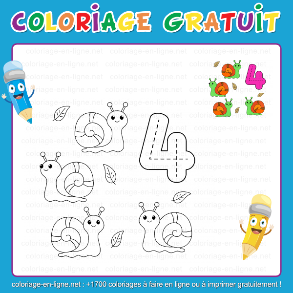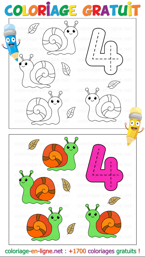 Prends tes crayons et amuse-toi à remplir ce coloriage : avec le chiffre 4 et ses escargots rigolos, tu découvriras que les nombres peuvent aussi se promener tout doucement dans la nature ! »