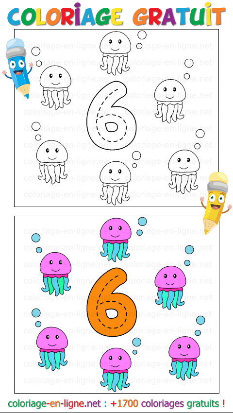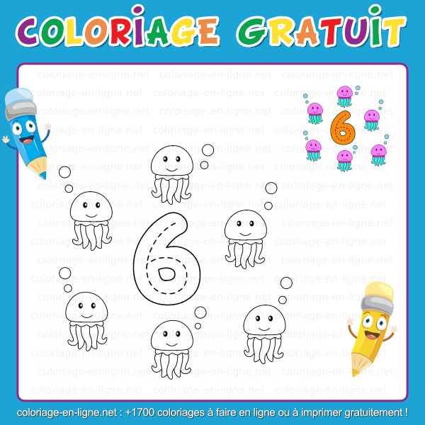Je suis un chiffre plein de surprises : il y a 6 faces sur un dé que l'on lance pour jouer, 6 cordes sur une guitare qui font résonner la musique, et même 6 pattes aux insectes qui courent et volent partout dans la nature. Dans le ciel, on trouve aussi les 6 côtés d'un flocon de neige, toujours parfaitement symétriques et magiques ! Regarde : 6 petites méduses flottent doucement dans l'eau, comme si elles dansaient avec les bulles. Tu peux colorier leur tête en rose, violet ou turquoise, et leurs tentacules en vert ou en bleu clair.