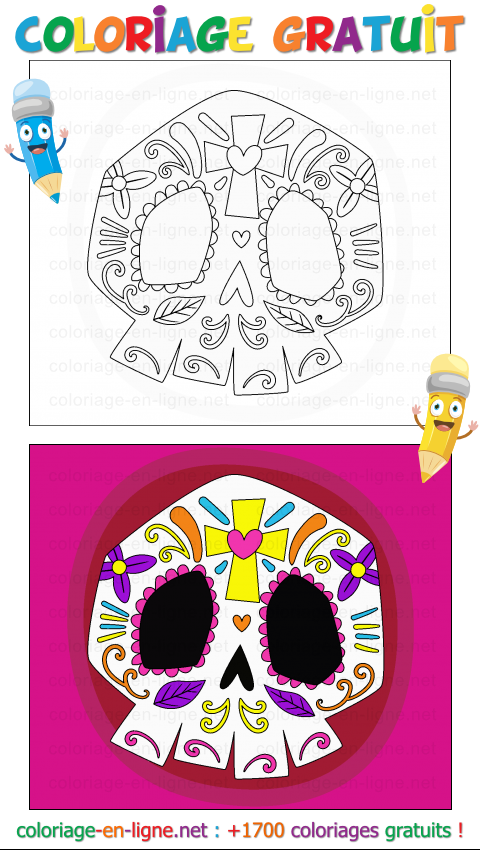 Ceci n'est pas un crâne... c'est une fête déguisée en coloriage ! Regarde bien : derrière ces grands yeux noirs et ces arabesques colorées, il n'y a ni peur ni frisson, mais un sourire invisible rempli de musique et de danse. Chaque motif â fleur, cĆur, volute â est comme une note d'une chanson joyeuse qui résonne dans les rues lors des célébrations. La croix et le cĆur sur le front brillent comme un soleil, et les couleurs éclatantes viennent chasser l'ombre pour laisser place à la joie.