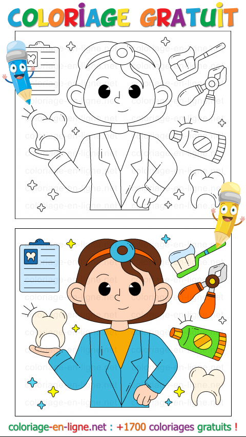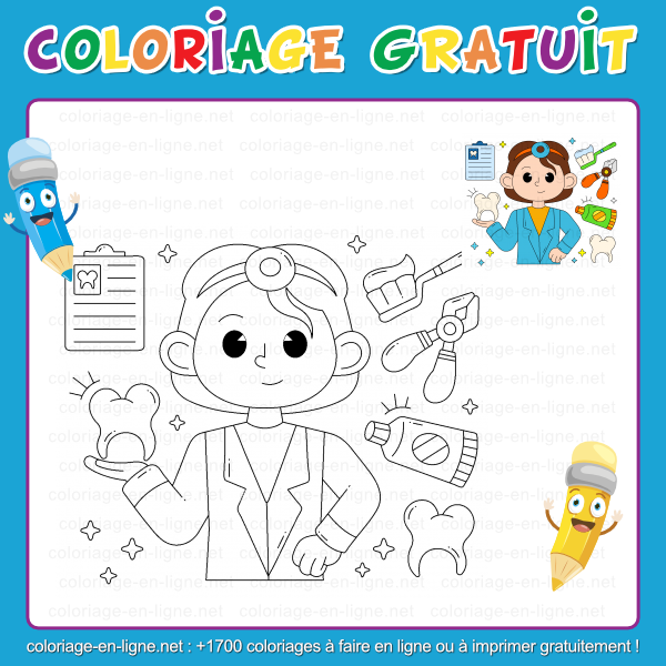 Ce coloriage met à l'honneur une dentiste souriante qui veille à la santé des dents ! Autour d'elle, on retrouve tout le nécessaire pour bien entretenir sa bouche : une brosse à dents, du dentifrice, une pince dentaire et un grand sourire éclatant.