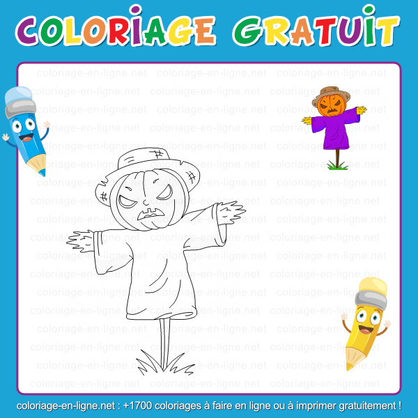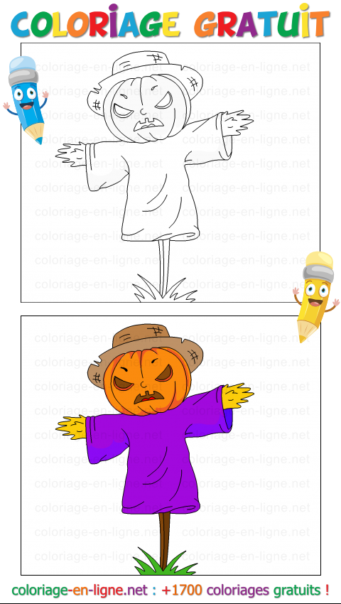 Que cet épouvantail a l'air féroce, avec sa tête de citrouille, ses mâchoires effrayantes, et ses grands yeux méchants ! De quoi vous glacer le sang, et, faire fuir les oiseaux ! Pour faire ce coloriage, tu peux utiliser un orange foncé pour coloriser la tête, un beige clair pour le chapeau, et un jaune très pâle pour les bras bourrés de paille... Utilise la couleur de ton choix, pour l'habit !