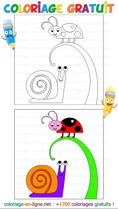 En suivant notre exemple colorié, tu pourras donner vie à cette scène amusante en peignant Speedy avec son corps violet éclatant et ses yeux noirs pétillants, tandis que sa magnifique coquille prendra une belle teinte orange avec des spirales plus foncées qui dessinent son motif naturel. Ruby sera resplendissante avec sa carapace rouge vif ornée de ses fameux points noirs caractéristiques, sa petite tête rose souriante et ses antennes délicates de la même couleur. Le brin d'herbe vert sur lequel elle se balance élégamment ajoutera une touche de fraîcheur naturelle à cette scène pleine de complicité et de joie de vivre.