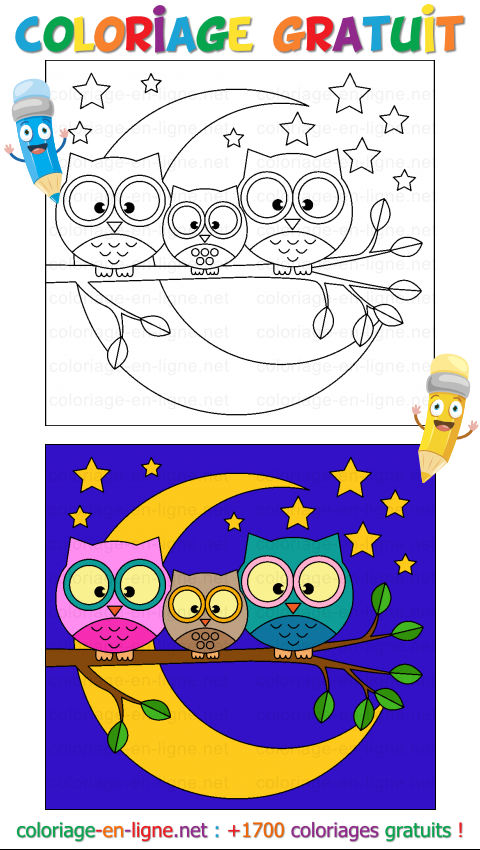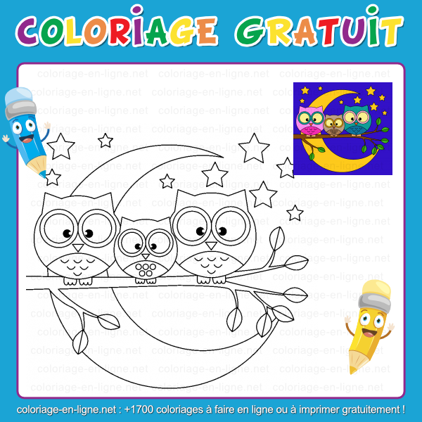 - Coloriage n°1271 - Famille de hiboux sur une branche d'arbre