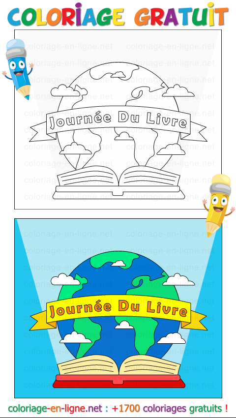 Chaque 23 avril, le monde entier tourne une page particulière de son calendrier : celle de la Journée mondiale du livre. Ce coloriage en est le symbole, une véritable ode à la lecture et au savoir. Au centre, notre belle planète s'offre à toi, comme si elle avait été doucement déposée sur un grand livre ouvert. Les continents, posés sur l'azur des océans, semblent flotter parmi des nuages légers, pareils à des pensées qui voyagent d'un pays à l'autre. Devant, une large bannière déroule fièrement ses lettres festives, comme un ruban qui relie tous les lecteurs, qu'ils soient enfants, parents ou grands-parents, d'un bout du monde à l'autre.