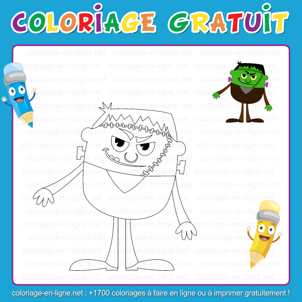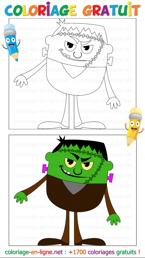 Cette créature d'une laideur effrayante est un mort-vivant constitué de différents morceaux de cadavres rapiécés avec des points de suture et des boulons... Création du docteur Frankenstein, ce géant de 2,5m est doté d'une force herculéenne ! Colorie sa peau en vert, ses cheveux et ses sourcils en noir, ses yeux en jaune pâle, et ses vêtements dans une couleur très sombre... Bon coloriage !