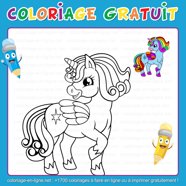 Prêt(e) pour une avalanche de douceur et de magie ? Ce coloriage te présente une licorne espiègle, aux yeux malicieux et à la crinière bouclée qui se déploie comme un arc-en-ciel dans le vent. Sa corne rose, toute en spirale, ressemble à une délicieuse sucrerie sortie d'une fête foraine â on dirait presque qu'elle sent la barbe à papa ! Sur sa croupe, une étoile mystérieuse brille, comme si elle renfermait un sort secret, et ses petites ailes colorées ne demandent qu'à s'envoler vers de nouvelles aventures.