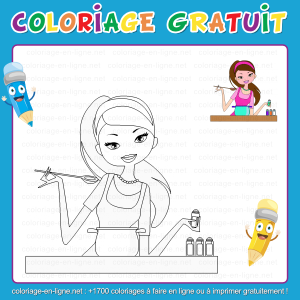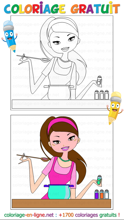 Tu peux utiliser une couleur brun clair pour la table, et un turquoise lumineux ou un bleu pastel pour colorier la casserole. Le tablier de maman peut être rose bonbon, assorti à son t-shirt rose plus clair, tandis que son serre-tête peut reprendre une nuance vive pour donner du peps à la scène. Ses cheveux peuvent être châtain foncé ou blond doré, selon ton envie, et tu peux lui donner un teint rosé ou pêche pour rendre son visage encore plus doux. Les petits pots d'épices peuvent être colorés en orange, violet, bleu ciel ou blanc, comme les vrais pots qu'on trouve dans les cuisines. Pour les ustensiles en bois, choisis un brun naturel, et n'oublie pas les détails comme les yeux, les lèvres, ou le collier, qui peuvent être délicatement colorés pour rendre l'ensemble plus vivant.