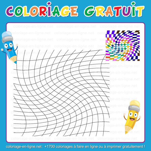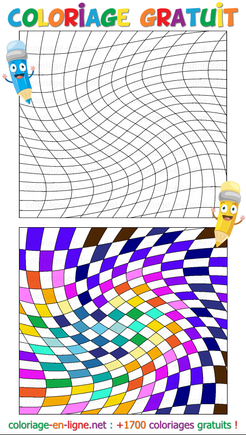 Ce coloriage, câest comme un tapis magique qui se tord et se plisse sous lâeffet dâun souffle mystérieux. Les lignes, au lieu de rester bien sages, se mettent à onduler comme des rubans au vent, et les carrés se transforment en petites tuiles dansantes. On dirait presque que le dessin cache un passage secret, quelque part entre deux vagues de formes.