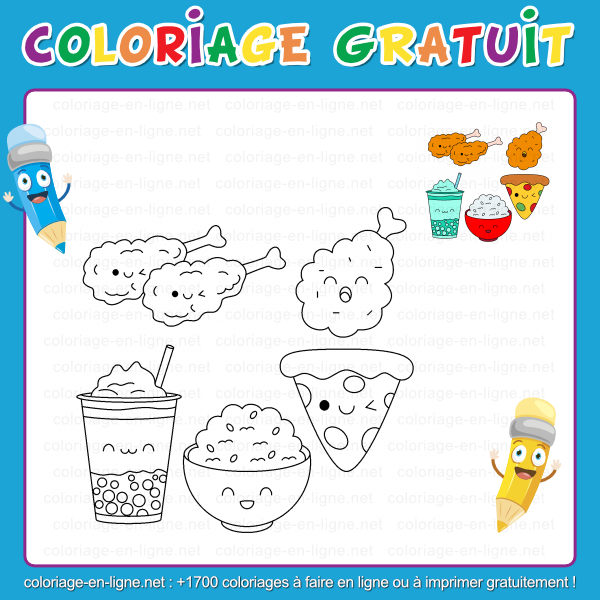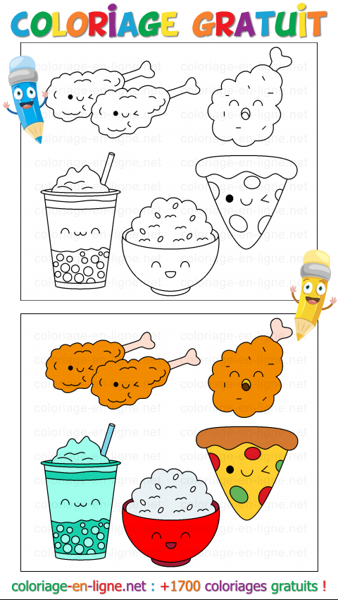 - Coloriage n°1660 - Nourriture kawaii (poulet frit, pizza, riz, etc.)