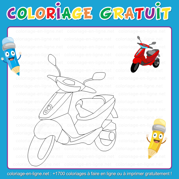 Pour donner vie à ce coloriage, tu peux coloriser la carrosserie en rouge éclatant ou en bleu électrique, les roues en noir profond, et les rétroviseurs en gris métallique. Tu peux aussi imaginer ton scooter avec des couleurs originales, comme un vert pomme pétillant ou un violet lumineux, afin de créer un modèle unique qui reflète ta créativité !