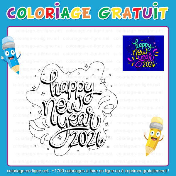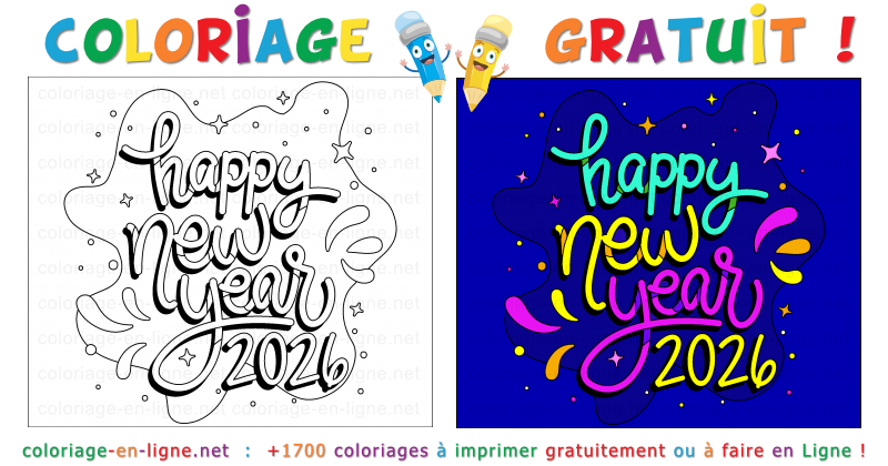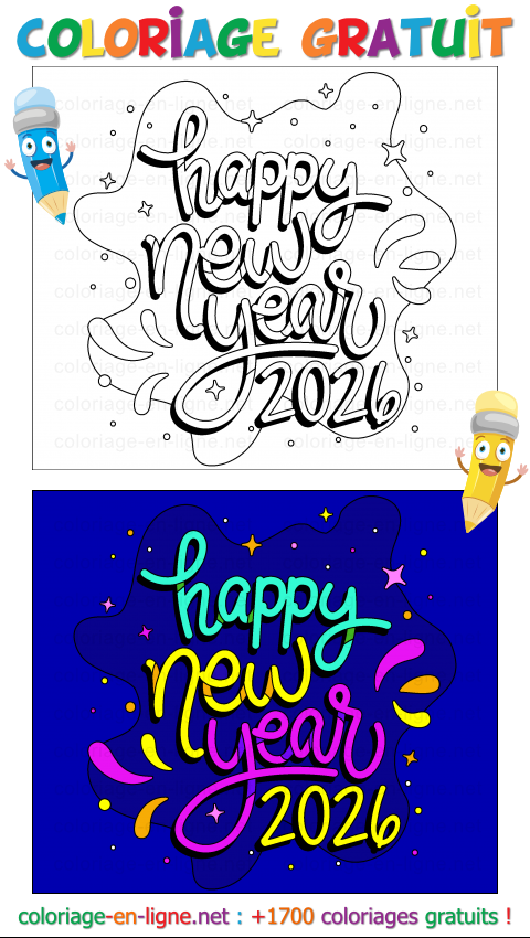 Sous un ciel bleu nuit comme celui du réveillon, les lettres de ce coloriage du nouvel an, semblent flotter dans l'air, rondes et entrelacées comme des bulles de fête. Elles se mêlent joyeusement, formant un message universel : "Happy New Year" signifie « Bonne année », ces mots que l'on échange à minuit, entre rires, embrassades et étoiles filantes.