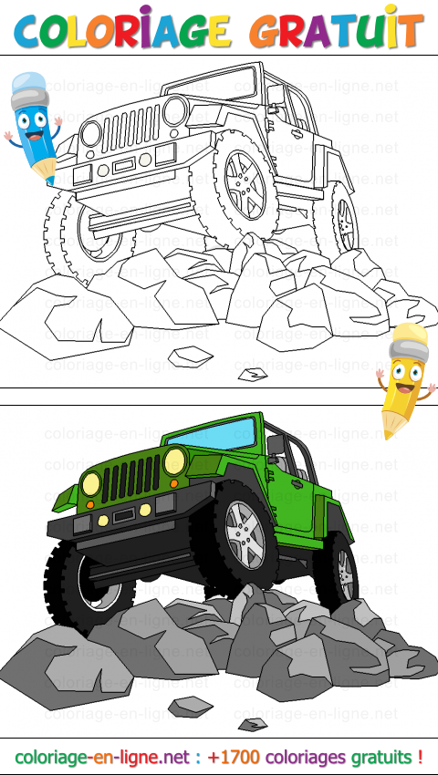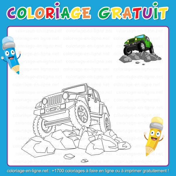 Pour mettre en couleurs ce coloriage, tu peux choisir un vert vif ou un jaune éclatant pour la carrosserie, afin qu'il se démarque dans la nature. Les pneus resteront bien sûr noirs profonds, avec des jantes gris métallisé. Les rochers pourront prendre différentes nuances de gris ou de brun, pour donner du relief au décor. Les vitres, elles, peuvent refléter le ciel en bleu clair ou en gris argenté, selon l'ambiance que tu veux créer.